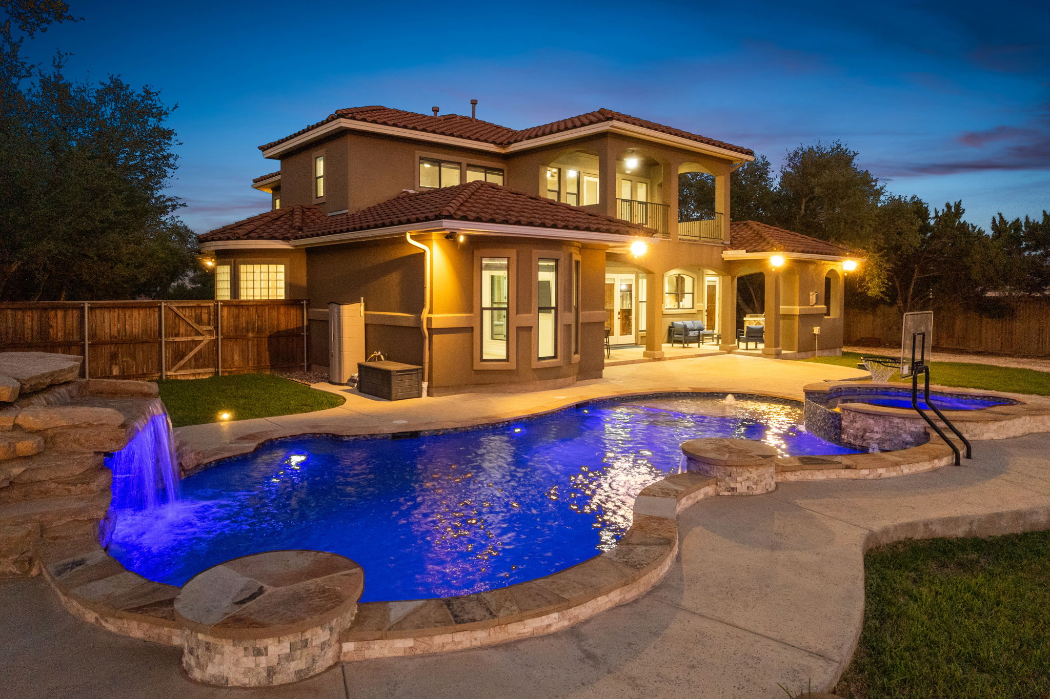 Tucked away on a quiet cul-de-sac, this exceptional Villas Hills residence offers a sprawling two-story layout with 4 bedrooms and 3.5 bathrooms. This Villas Hills home is a rare find for those seeking a private pool and a dedicated court for pickleball, tennis, and basketball. This estate welcomes you with meticulous detailing and an inviting atmosphere that highlights the quality of the build. The location offers a peaceful pace while remaining just 4 miles from HEB and a few minutes further from a multitude of dining and entertainment options, Costco, Target, and the Cinemark. A dining area sits just off the foyer, leading into an expansive living room where a wall of glass doors and windows opens entirely to the patio. This main gathering space features a fireplace and custom built-in shelving and cabinetry. The kitchen is designed with an oversized center island that has a wrap-around bar top for morning coffee or evening drinks, wood cabinetry, wine storage, and a stainless gas cooktop with a built-in oven and microwave. The primary suite is located on the main floor for ease of movement, offering a bay window and a bathroom with two vanities, a center jetted tub, and a walk-in shower. One of the most unique elements of this Villas Hills home is the private office, which sits midway up the staircase. This secluded retreat is tucked away from the main floor traffic and opens to a small Juliet balcony at the front of the home. The 2nd floor features a large game room with access to a rear-facing balcony, along with 3 guest bedrooms. The outdoor space is a true extension of the home, featuring a covered patio with an outdoor fireplace, grill, and sink for weekend hosting. The in-ground pool and spa offer a serene waterfall. The private sports court is ready for basketball or a quick match. This Villas Hills property offers a complete lifestyle package, blending refined interior spaces with an expansive backyard and easy access to the best of the surrounding area.